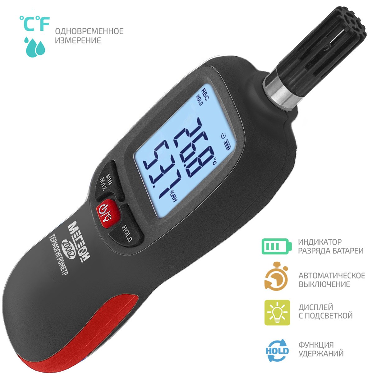 МЕГЕОН 20062 – новинка в модельном ряду цифровых высокочувствительных термогигрометров. Представленный прибор предназначен для быстрого определения параметров температуры и влажности с высокой точностью в помещениях и на открытом пространстве. Помимо этого с его помощью можно определить точку росы, снять показания влажного термометра, а также зафиксировать максимальные и минимальные значения измеренных данных. Преимуществом также является функция записи результатов в память ёмкостью 999 ячеек. Измеритель получил современный дизайн и компактные размеры. Модель имеет эргономичную форму корпуса, удобное расположение органов управления на передней панели и большой ЖК- дисплей с яркой светодиодной подсветкой. На заднее стенке предусмотрено монтажное отверстие для установки на штатив, благодаря чему достигается максимальное удобство при эксплуатации.