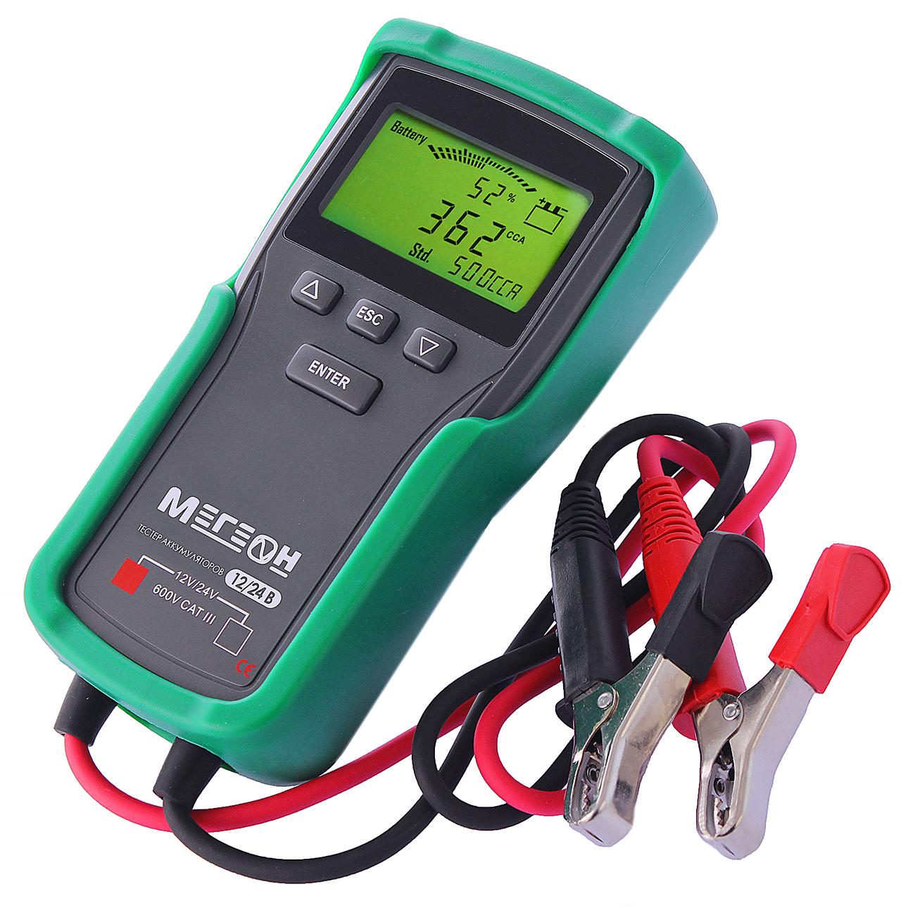 МЕГЕОН 81024 — это удобный портативный тестер 12/24 вольтовых кислотных аккумуляторных батарей. Лёгкий, компактный, прибор с питанием от проверяемого аккумулятора. Для правильного отображения результатов ему необходимо ввести только ток холодного пуска, поддерживается 5 стандартов в которых этот параметр указывается (DIN, EN, IEC, CCA, JIS), для перевода последнего используется таблица из комплекта поставки. Остаточный ресурс вычисляется на основе полученных данных при измерении внутреннего сопротивления согласно методике IEEE 1118-1996, и напряжения. Кроме этого он позволяет фиксировать пиковые значения на клеммах в пусковых режимах, потребление различных нагрузок и проверять схему зарядки. Он найдёт широкое применение при предпродажной проверке и диагностике систем электропитания автомобилей.